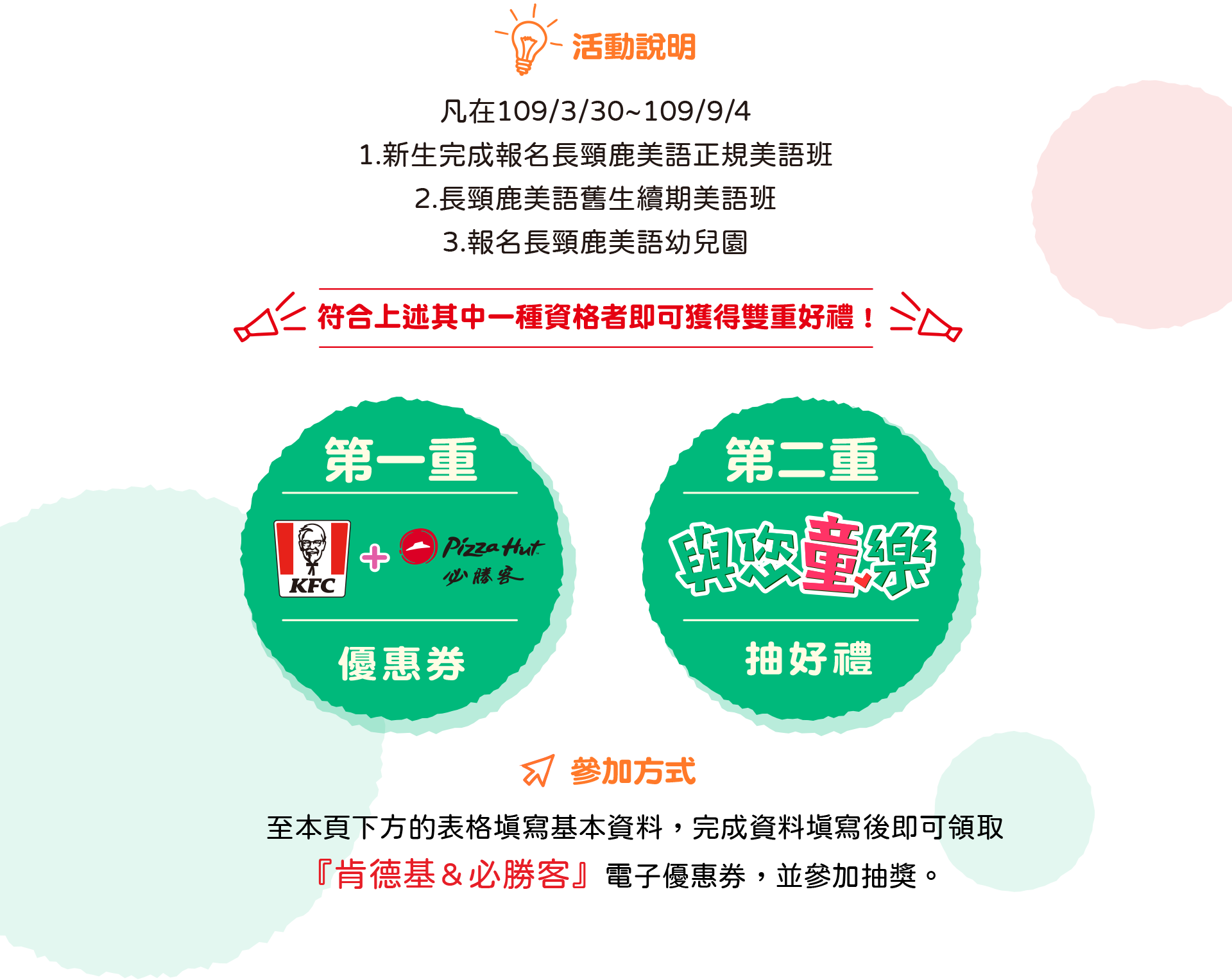 1. 沒有報名長頸鹿美語課程者或資料填寫不完整者,無法參加抽獎活動。